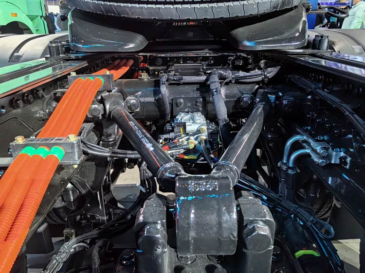 鹰驰电驱桥展车采用6×4驱动形式,轴距3800+1350mm,准牵引39.22吨。