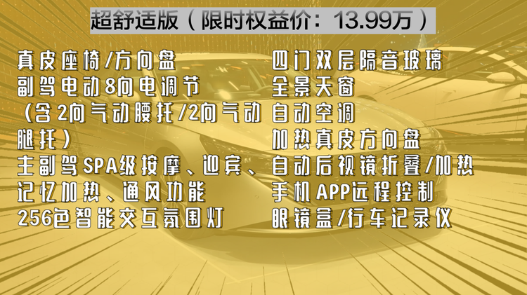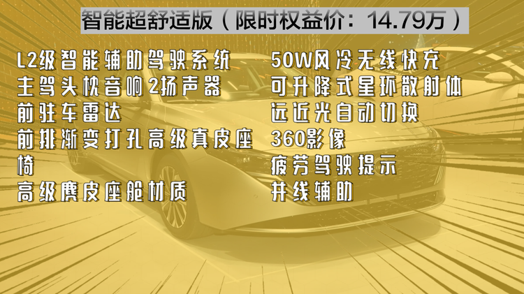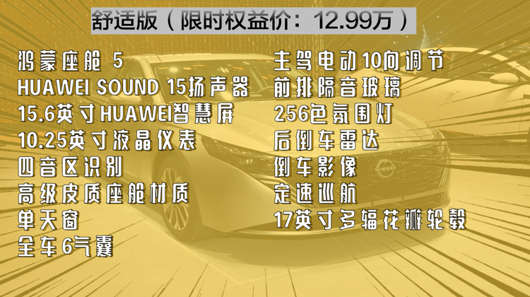首先入门款2.0L舒适版,限时价格12.99万,具体配置参数看图就行,对比老款的畅销款 悦享版,主要是多了鸿蒙座舱,同时两块屏幕的尺寸都更大了,有了华为的15扬声器,还有256色的氛围灯,当然也有些配置缩水,例如全景天窗缩水成小天窗,真皮座椅换成了仿皮座椅,自动空调减配成手动空调。功能配置有增有减,总算下来,肯定是新款更好,不过价格上,大约比悦享版贵5000元。单看这个入门款 还是值得买的,但是它完全经不起对比!