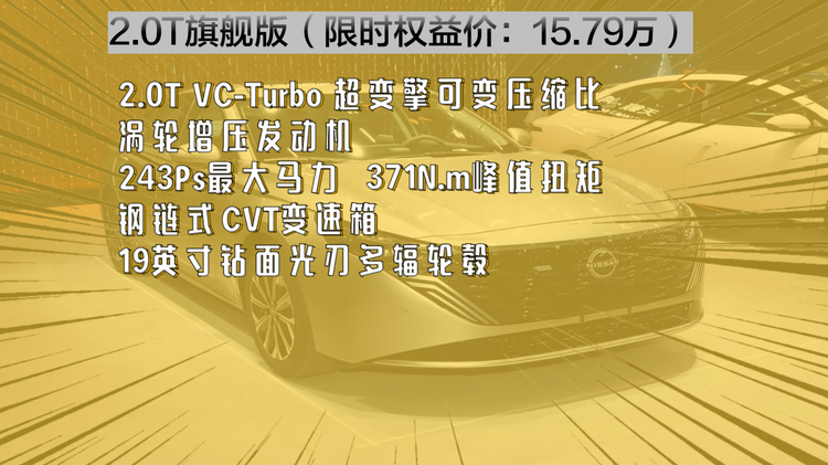 不过新天籁这款车,最值得入手的应该是2.0T旗舰版。价格上虽然又贵了1万,不过2.0L自吸换成2.0T,变速箱换成钢链式的,17英寸轮毂升级至19英寸。天籁的2.0T发动机,动力比迈腾380的动力都要强,还能加92号的油,钢链CVT变速箱没有冷保护,2.0L自吸版本,启动时就有冷保护,也就是说刚开车的几分钟 你是跑不快的,冷保护过了,才能正常行驶。所以北方用户,2.0T版本的体验感受要好很多。