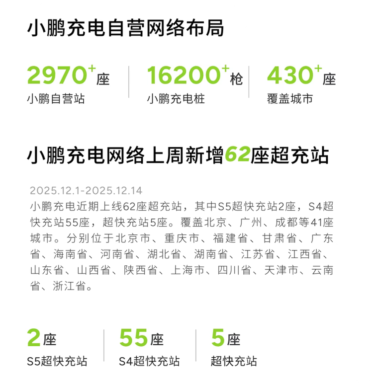 近日,小鹏汽车对外公布了自营充电网络建设的最新进展。相关信息显示,在2025年第49和50周,小鹏共上线了62座超充站,使得自营充电网络整体规模有了进一步拓展。截至目前,小鹏充电的直营站点数量达到2970座,充电桩总数则为16200枪,这些设施覆盖了全国430座城市。