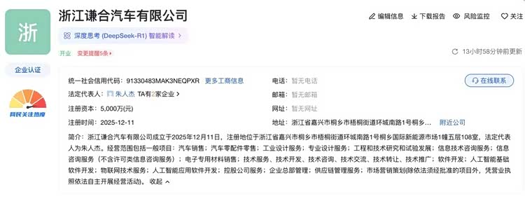 虽然合众新能源已经公布了选定经营管理受托方的消息,但尚未披露具体公司是哪家。不过外界猜测,可能与山子高科有关。就在近期,山子高科在桐乡成立新公司。12月11日,浙江谦合汽车有限公司成立,注册资金5000万元,法定代表人为朱人杰,经营范围包括汽车销售;汽车零配件零售等。而桐乡这个地方,正是哪吒汽车的三大生产基地之一。
