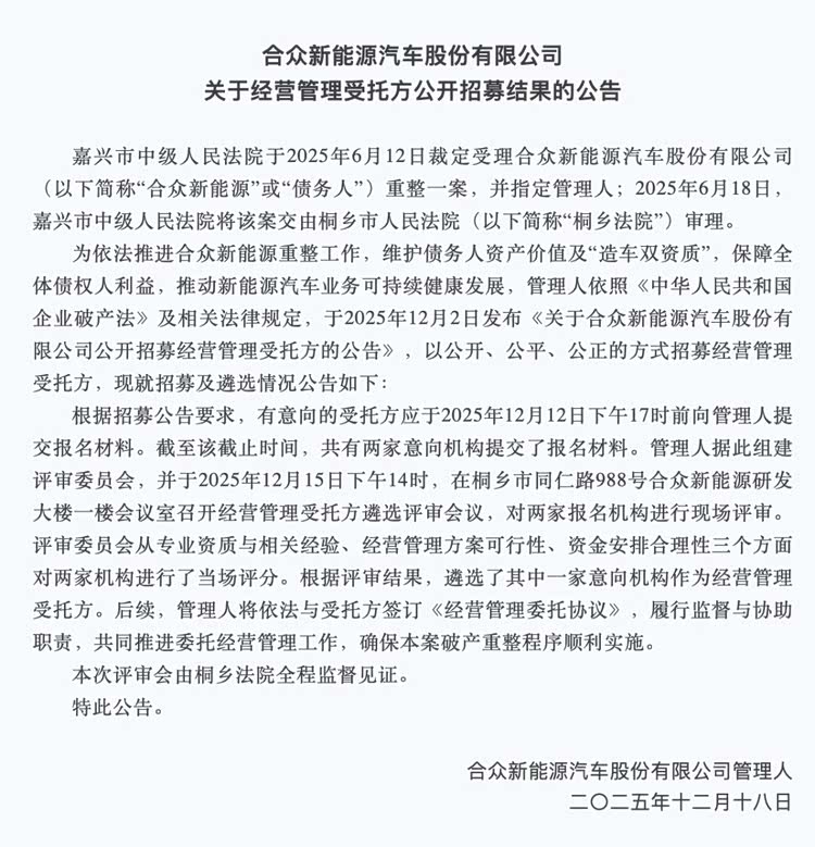 12月18日,合众新能源汽车股份有限公司(哪吒汽车母公司)管理人发布了关于经营管理受托方公开招募结果的公告。根据公告,此次共有两家意向机构提交了报名材料。管理人组建的评审委员会,从专业资质与相关经验、经营管理方案可行性、资金安排合理性三个方面对两家机构进行了遴选评审。根据评审结果,遴选了其中一家意向机构作为经营管理受托方。