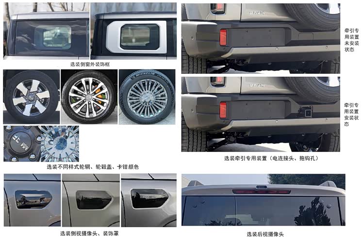 选装配置方面,厂家提供了不少个性化选项。轮辋的样式可以有不同选择,轮辋盖、卡钳颜色也能调整。侧窗装饰框、全景天窗、固定踏板这些都可以根据需求添加。还有牵引专用装置、备胎罩、多种车衣颜色和图案等等。侧视摄像头、后视摄像头以及ETC设备也出现在选装清单里。这些配置让用户有更多自由度,但会不会成为标配,目前还不太清楚。