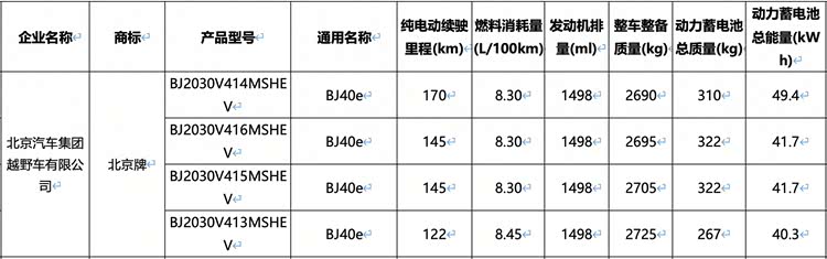 近日,工信部公布了 北京越野BJ40增程(参数|询价)车型的新一批续航信息,其中提到了不同电池容量的版本。根据披露的内容,新车将配备三种规格的动力电池,容量分别为40.3千瓦时、41.7千瓦时和49.4千瓦时,对应的纯电续航里程大致在122公里、145公里和170公里左右,不过具体的测试标准尚未明确。作为对比,目前在售的BJ40增程版本搭载的是40.3千瓦时的三元锂电池,在WLTC和CLTC工况下,纯电续航分别标注为126公里和152公里。