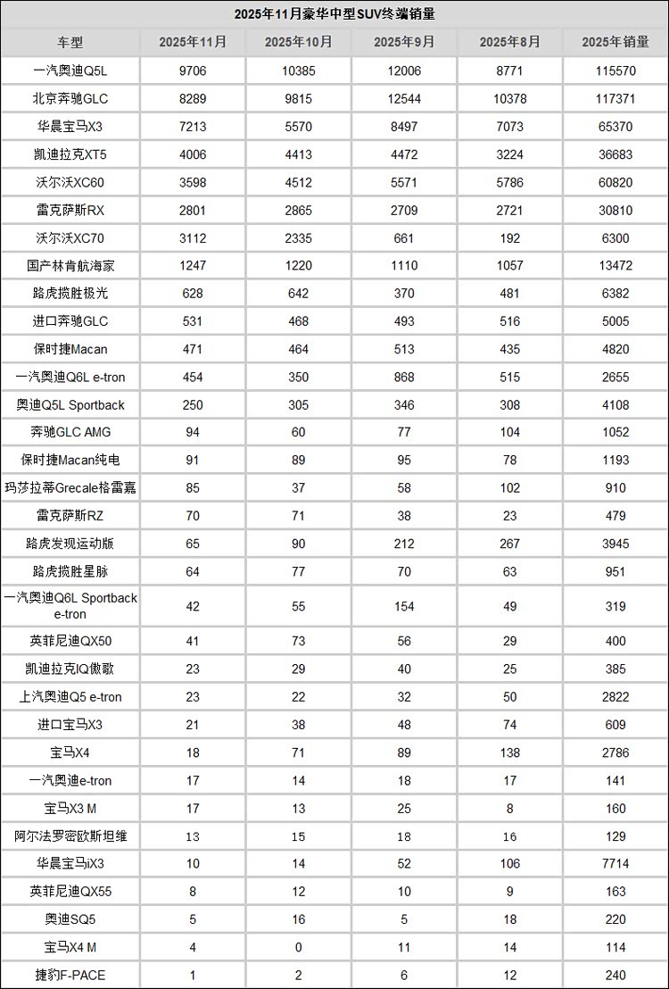 在2025年11月,即将换代的一汽奥迪Q5L延续着之前的不错势头,以9706辆的成绩,再一次成为月度销量冠军。今年前11个月,Q5L总销量115570辆,与北京奔驰GLC的销量差距进一步缩小。北京奔驰GLC的11月终端销量为8289辆,前11个月总销量117371辆,因为与奥迪Q5L在总销量上的差距并不大,它依然有被超越的可能。华晨宝马X3的11月终端销量为7213辆,今年前11个月总销量为65370辆,与另外两款车型差距不小。