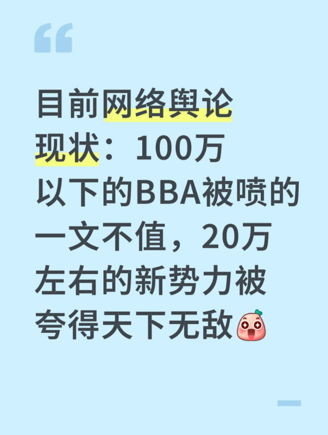 “100 万以下的 BBA 不如 20 万新势力” 的论调,如今在网络上越来越响 —— 一边是 BBA 被喷 “油车老古董”,一边是新势力被夸 “天下无敌”,但这种 “极端对立” 的舆论,其实藏着认知的 “双标”。