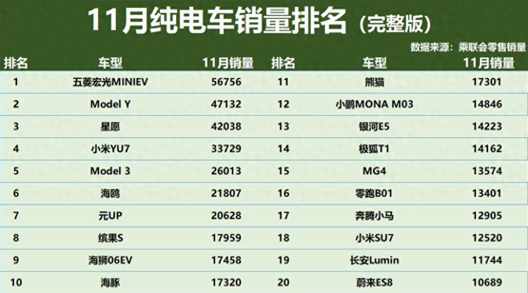 当各大车企晒出11月的纯电销量成绩单,前20款纯电车型均月销破万。看起来相当喜大普奔。五菱 宏光MINIEV(参数|询价)以超5.6万辆的成绩登顶,再次证明了“人民需要什么,五菱就造什么”可以经年常青。但在这份捷报背后,也可谓是几家欢喜几家愁。