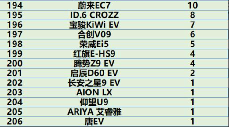 看到榜单最尾端,还有46款车月销不足百辆。更有甚者,月销不足10辆,其中耳熟能详的就有百万豪车仰望U9,月销仅1辆。
