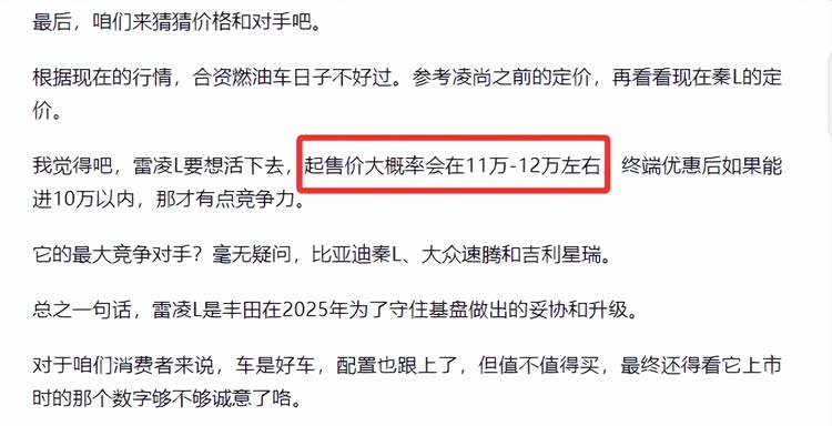 除非,我是说除非啊,终端能立马给出2-3万的优惠,把实际落地价拉回到10万出头,那这车配合丰田的口碑和TSS 3.0的安全配置,还是很香的。