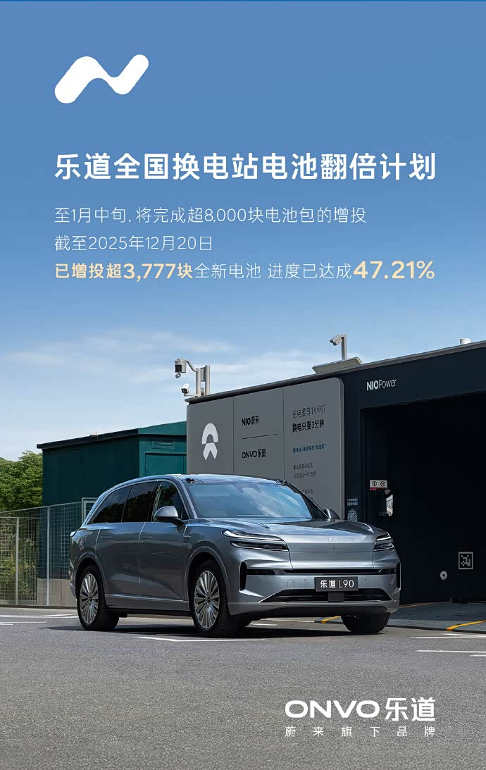 蔚来旗下品牌乐道汽车近日公布了其换电网络电池增投计划的最新进展。该公司表示,为提升换电服务能力,已启动向现有网络补充电池数量的工作。这项计划于本月初正式对外公布。乐道汽车在12月5日宣布,将在全国范围内的换电网络中,增加投放超过8000块全新的电池包。根据最新信息,截至12月20日,新增电池的部署数量已经超过3700块。从整体计划来看,目前完成的进度大约在百分之四十七左右。按照目前的推进速度,乐道汽车预计,全部8000多块新电池的增投工作,将在明年1月中旬完成。届时,其换电网络中可供乐道车型使用的电池总量,将比计划实施前提升一倍以上。