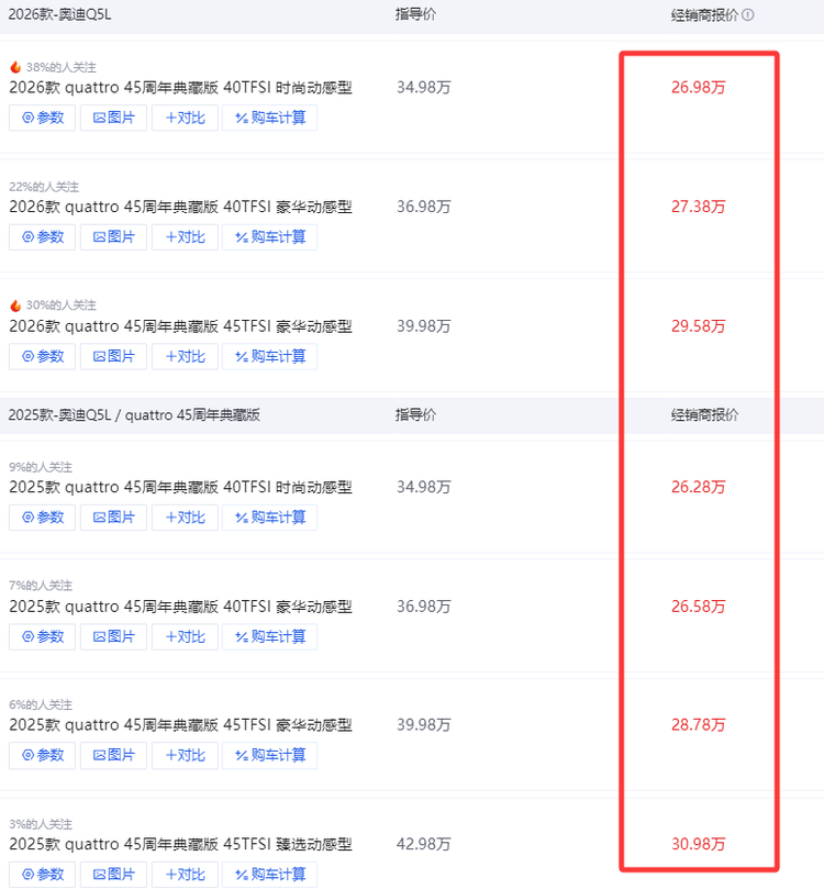 但车友们别忘了,老款Q5L在终端可是有着巨额优惠的,裸车经常干到26、27万。