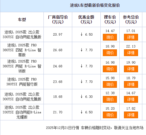 车家号·0浏览·2025-12-21 20:56 · 广东近期车市重磅福利来袭, 上汽大众途观L(参数|询价)推出限时钜惠,部分车型直降7.7万,裸车价低至15.98万即可入手,这一诚意满满的降价政策瞬间引爆全网,网友纷纷留言“德系中型SUV这价太香了”“闭眼冲不亏”。