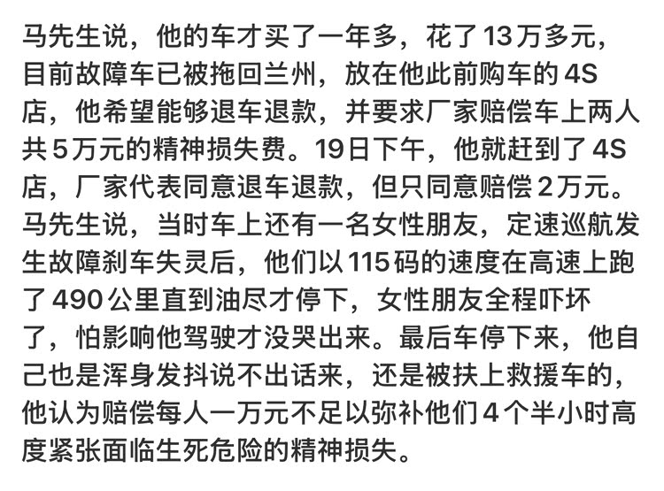 定速巡航和刹车失灵,高速狂飙490km的事件后续来了,车主马先生和4S店协商要求退车退款+5万精神损失费,厂家从最初赔2万涨到4.5万,但要求不能向第三方透露相关内容,马先生认为不合理。
