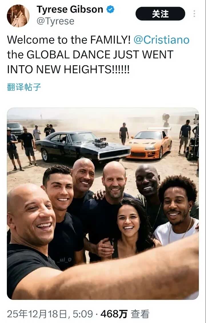 12月18日,在"速激"系列电影里饰演罗曼的泰瑞斯·吉布森在其社交网站上晒出《速11》剧组工作照,C罗赫然在列。据悉,这是C罗进组拍摄的第一天。