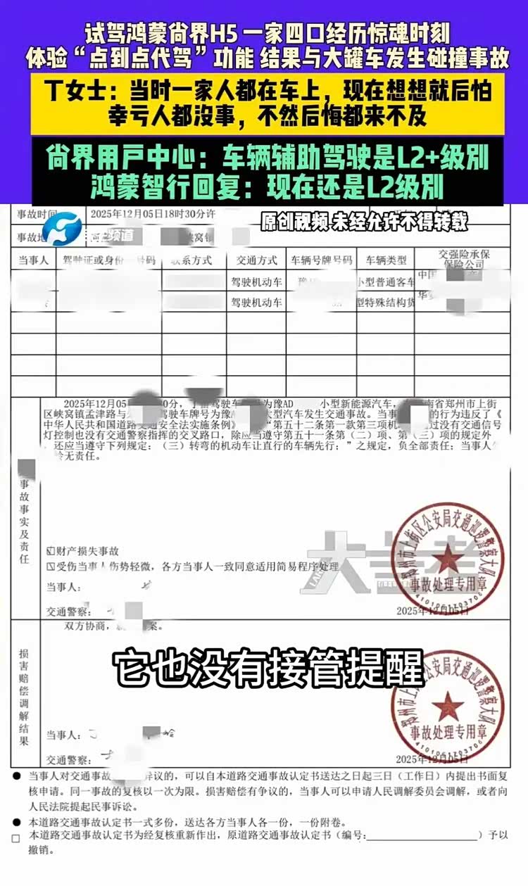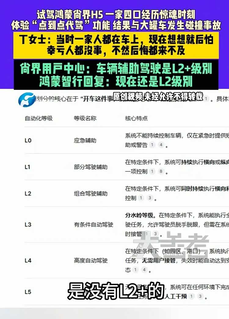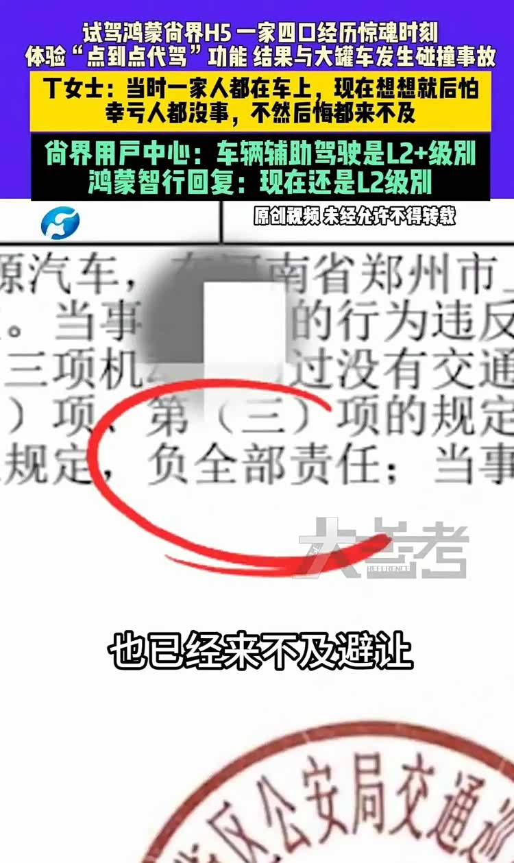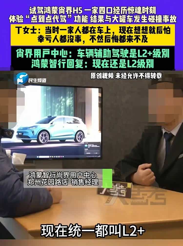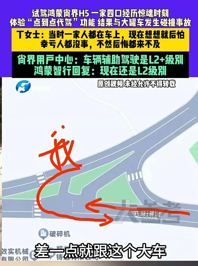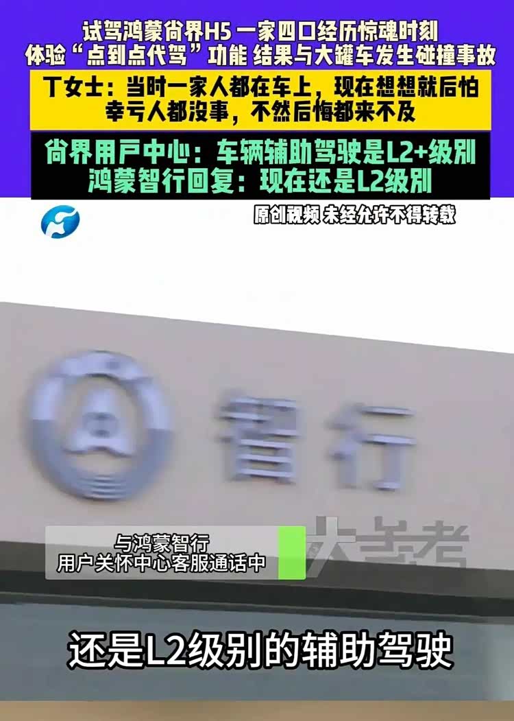 丁女士称:“当时我们全家大小四口人都坐在车上,差一点就跟这个大车进行这个正面碰撞,感觉就是死里逃生。他们给我们宣传的就是鸿蒙系统的这个乾崑4.0,可以实现点对点的完全的代驾。”