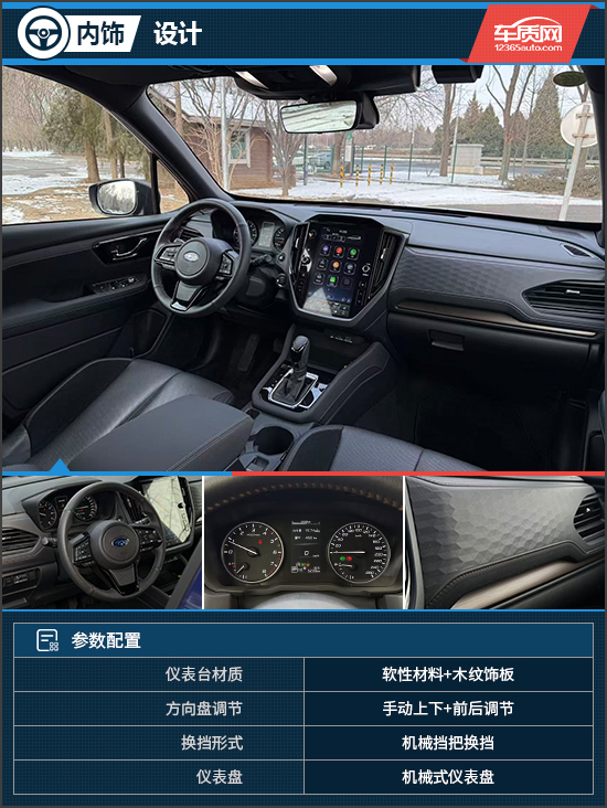 进入车内,全新斯巴鲁森林人的座舱布局比较传统,软性材质与木纹饰板相搭配,触感与质感兼备。座椅采用真皮与奥司维面料的组合,触感细腻柔软。机械式仪表盘清晰直观,为驾驶者保留了一份纯粹的机械质感,中间的彩色液晶行车电脑显示屏中,除了常规的行车信息之外,还可以显示导航和多媒体等。