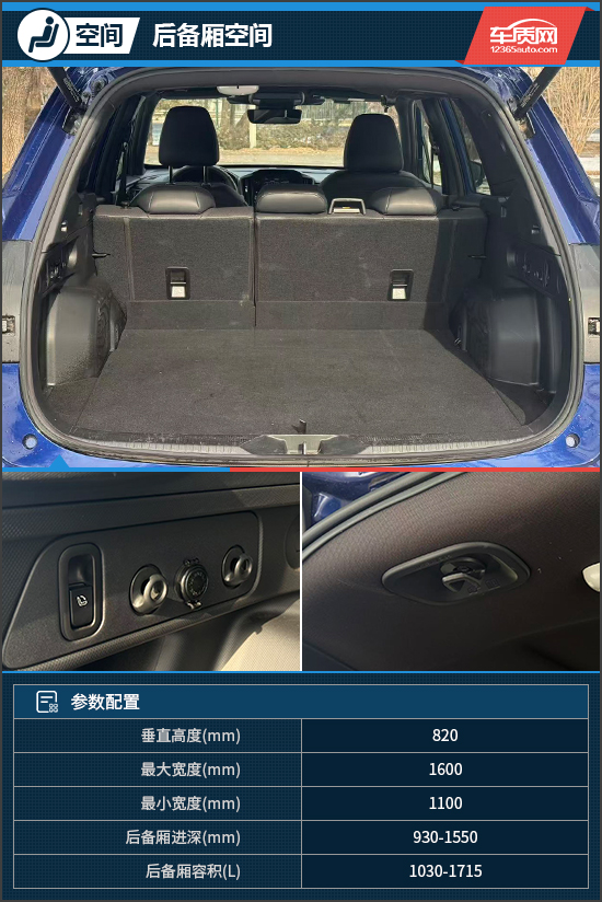 后尾门支持电动开启,打开后可以发现,后备厢空间规整,常规状态下容积为1030L。同时,后备厢左右两侧均配备了后排座椅一键放倒按键,座椅放倒后容积可扩展至1715L,装载能力进一步提升。此外,后备厢还提供了挂钩、12V电源等功能,能满足多场景出行需求。