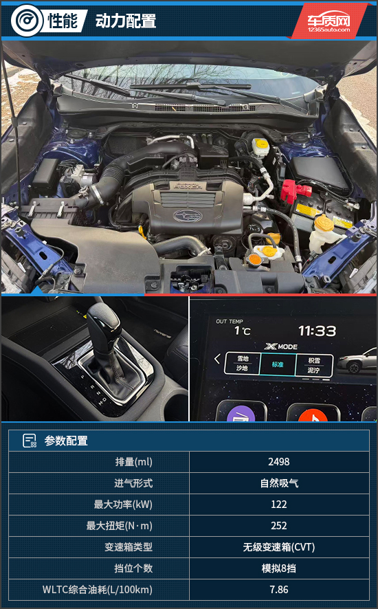 全新斯巴鲁森林人搭载2.5L水平对置四缸自然吸气发动机,最大功率122kW,峰值扭矩252N·m。与之匹配的传动系统为模拟8速的CVT无级变速箱,并标配全时四驱系统。