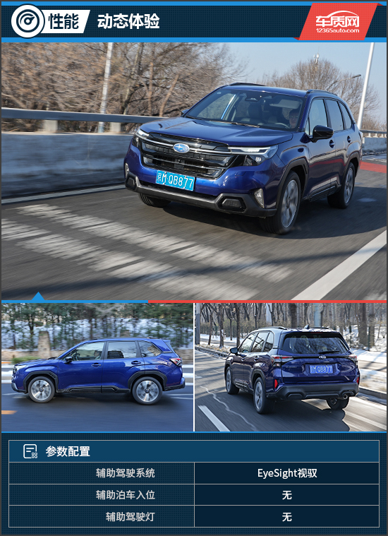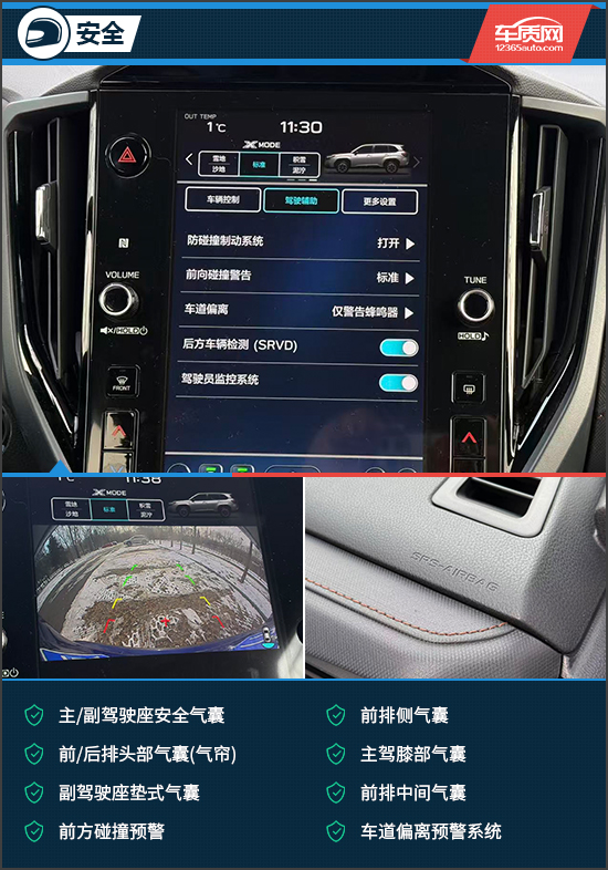 此外,评测车搭载了斯巴鲁EyeSight视驭驾驶辅助系统,提供紧急自动转向辅助、车道居中保持以及起步油门误操作预防等实用功能,进一步增强了行车安全。使用时按下方向盘右侧拨杆即可开启,此时系统会有图标进行提示。