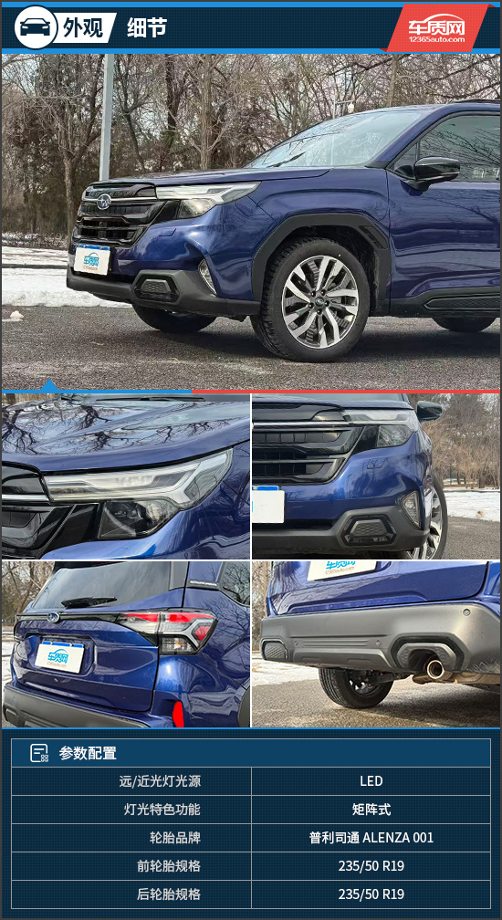 车尾造型方正挺拔,左右两侧尾灯组由一道黑色饰条相连,内部转向灯为卤素光源,点亮时虽效果一般,却具备维护便捷、成本更低的实用优势。后包围下部覆盖了大面积黑色防擦饰板,配合外露式排气布局,进一步强调其越野属性。此外,评测车采用普利司通ALENZA 001轮胎,拥有出色的静音性和干/湿地制动性能。