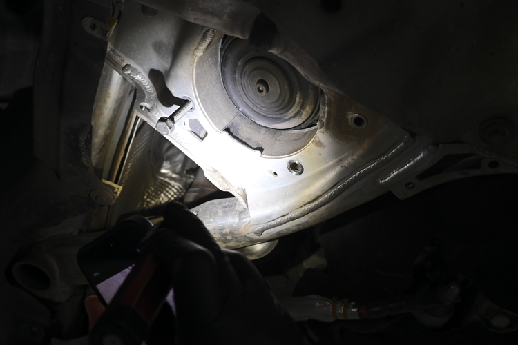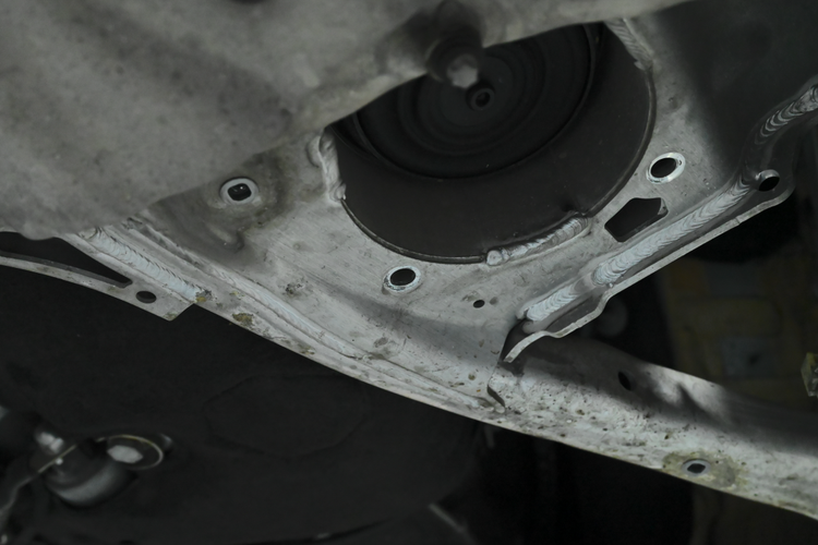 找准孔位,从多角度打光发现,这个固定螺栓贯穿副车架,外部的螺孔的确是10.5mm,架梁中部的轴套孔径也一致。需要扩孔的,是内侧板材——这会改变螺栓固定角度。