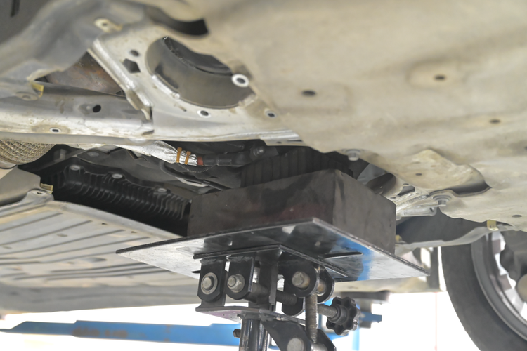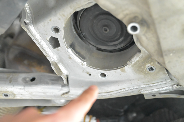 不过我们的技师想知道,维修之后发动机是否也会产生位移,毕竟这改变了机脚垫的位置——图上移动机脚的黑色印记清晰可见。经过测量,发动机的高度的确整体下落了3mm,肉眼看不出来。