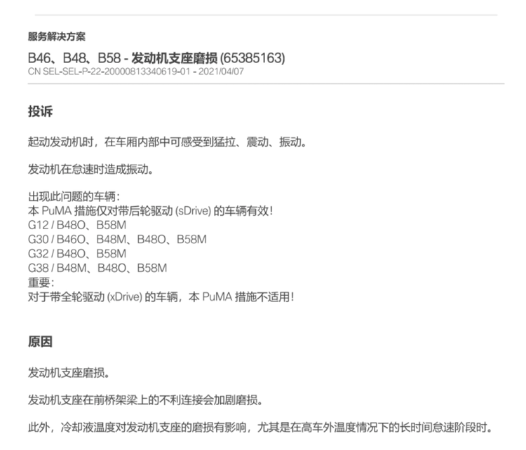 宝马在前两年发布了一份技术通告,内容大致是讲部分搭载B46、B48、B58的车型,可能会遇到,发动机启动的一瞬间,较为剧烈的震动(不是错别字,因为不属于振动了)。主要集中在16年后的7系,以及17年后的5系身上。很荣幸,我们这台车就在范围内。