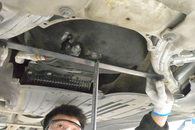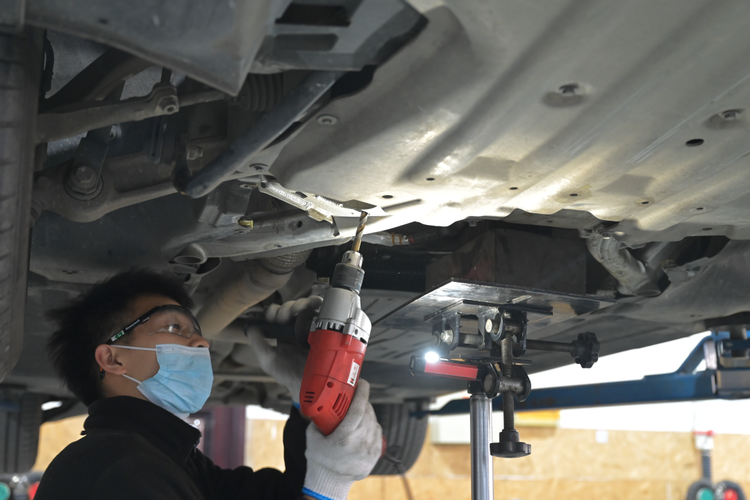 车子顶上举升机,找到通告里指定的螺孔——这个费了点时间,因为一边有三个,而且测量孔径好像都没有问题,而通告内出现了“禁止修整另外两个钻孔”的字样,不可贸然钻孔。