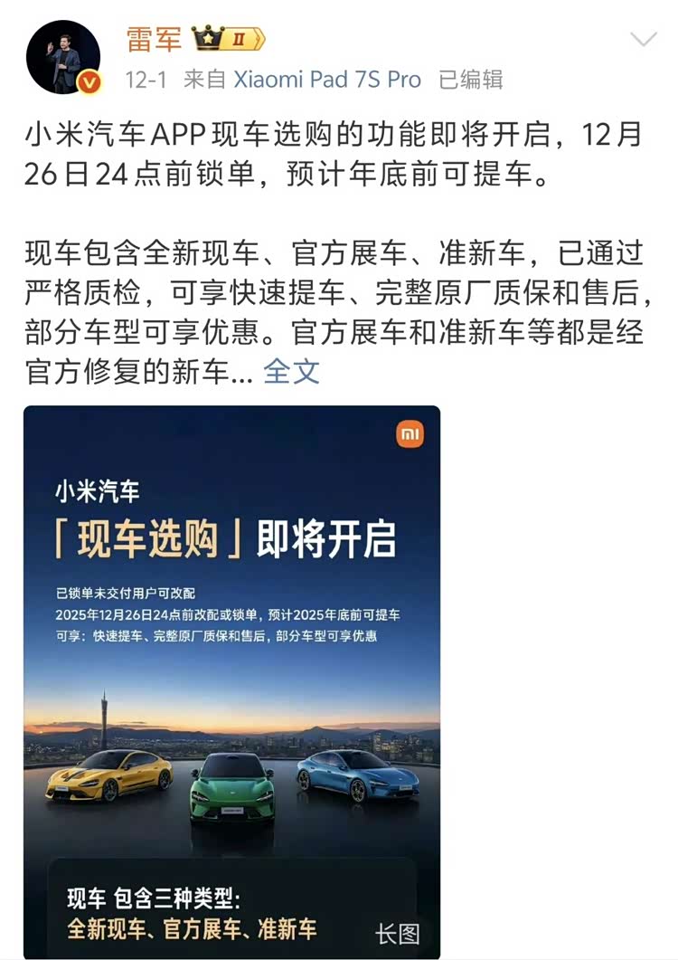 2025年,小米汽车遭遇了不少水逆时刻,仅12月开放的现车选购活动,就引发了不少质疑,尤其是现车销售=卖不动的刻板印象,让很多人觉得小米的爆款杀招已经失灵了。