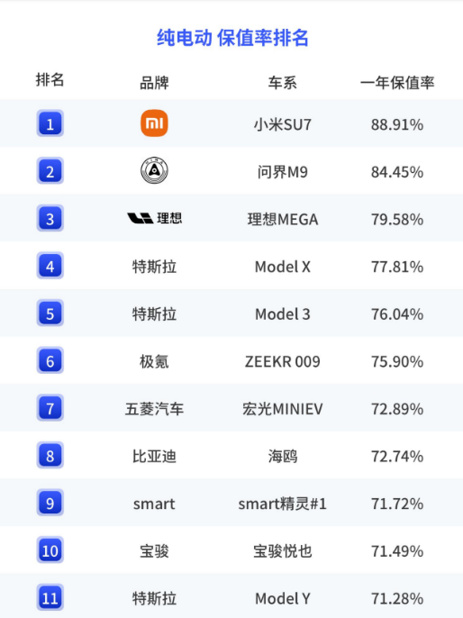 更难得的是,小米SU7还打破了电动车不保值的行业痛点,在中国汽车流通协会发布的报告中,其一年保值率高达88.91%,稳居纯电车型第一,且连续三个月蝉联该榜单。