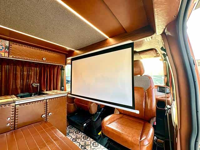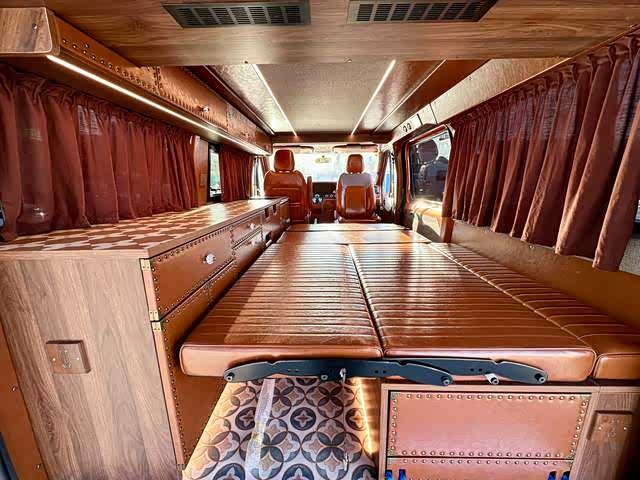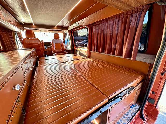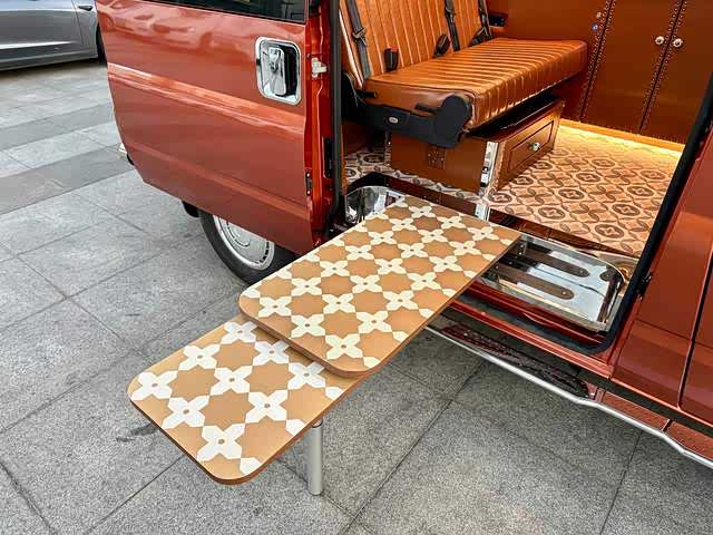 走进车内,美式复古风情与实用主义设计撞个满怀。驾驶室操控台、主副驾门板均采用美式复古油蜡皮包覆,双色搭配更显质感,驾驶舱顶棚的高级麂皮软包则提升了整体格调。中排多功能三人座椅与后排折叠沙发床灵活切换,满足乘坐与休憩双重需求,4门5座的MPV车身结构,让家庭出行或好友结伴都毫无压力。全车双层隔音保温设计隔绝外界喧嚣,定制高端麂皮隐私面帘则守护专属静谧,美式复古印花地板与哑光迎宾踏板,细节处尽显精致。