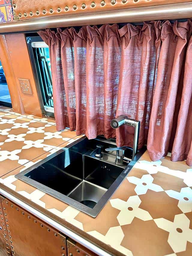 储物空间的巧思设计,让旅居生活告别杂乱。车厢内顶格栅板储物吊柜、左侧多功能高柜、右侧多功能魔盒与驻车空调造型吊柜,形成全方位储物体系,露营装备、生活物资皆可各归其位。而黑色不锈钢纳米水盆、古铜复古上弯水龙头与50L PE食品级清水箱、26L灰水箱的搭配,构建起完整的生活用水系统,户外抽拉淋浴花洒更让露营也能享有舒适洗漱体验。