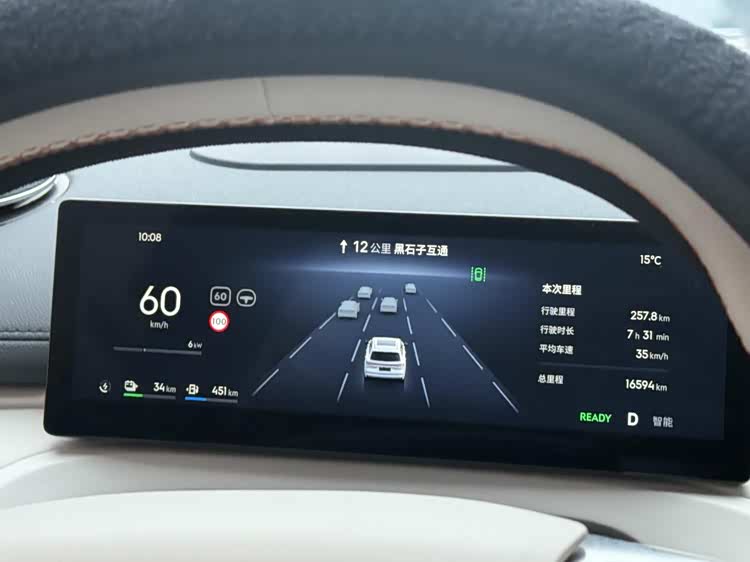 我们的试驾路线单程约120公里,往返总里程近240公里,覆盖了城市道路、沪渝高速与包茂高速的快速路段,以及蜿蜒至华蓥山的210国道盘山公路。其中山路多由连续的S弯与回头弯构成,更有仅容一车通过的狭窄挂壁路段,足够全面考验车辆的舒适、智能、续航、动力与能耗表现。出发前瞄了一眼仪表,纯电续航显示仅剩34km,接近馈电状态。这恰好让我们能探探它的真实功底——既要看它在馈电且路况复杂的条件下能耗表现如何,也想体验它的各项核心本领是否足够扎实。