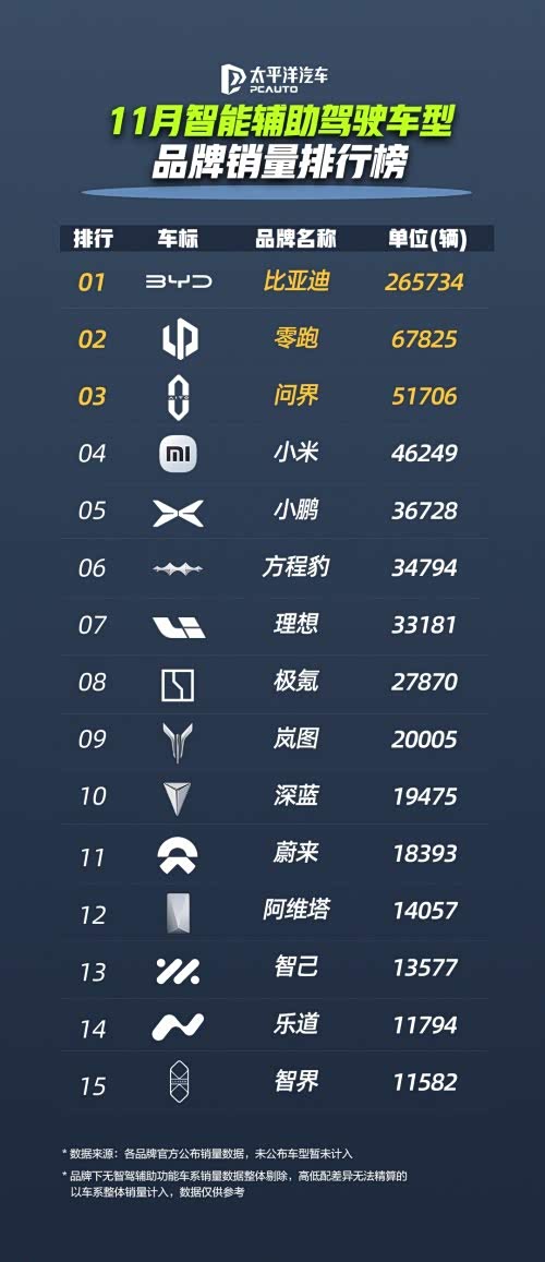 近日,比亚迪公布了其搭载天神之眼辅助驾驶系统的车型在11月的销售数据,全月销量达311267辆,继续引领市场。其中,比亚迪王朝与海洋系列贡献265734辆,方程豹、腾势、仰望等高端及个性化品牌亦表现稳健,共同构筑了比亚迪在智能驾驶领域的强大产品矩阵。