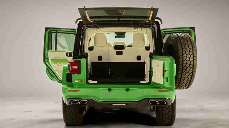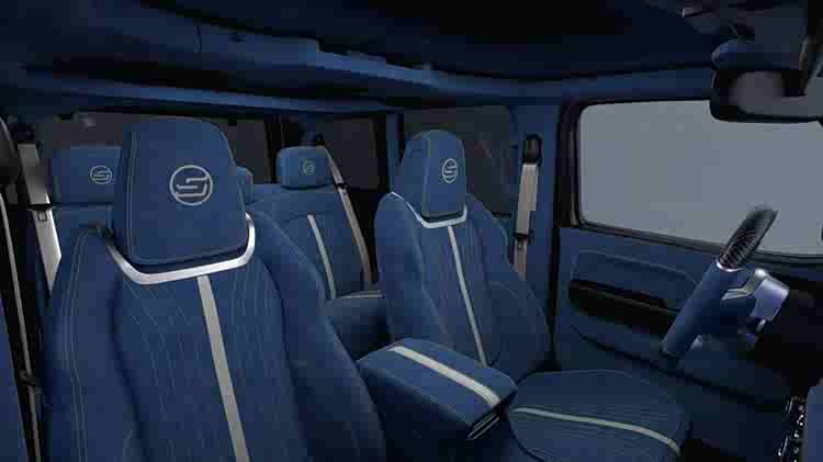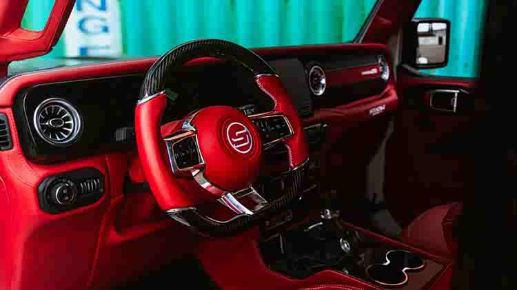 新车内饰则彻底告别工具车属性,氛围相比原厂牧马人明显精致得多,采用了Nappa真皮+Alcantara翻毛皮+碳纤维装饰件组合,座椅部分配有醒目的绗缝图案,整体触感与视觉效果都更高级、更现代。并针对信息娱乐系统、音响系统以及驾驶辅助系统进行深度定制与强化。同时,新车的官图也暗示,无论是内饰还是外观,都可以根据客户个人喜好进行高度个性化定制。