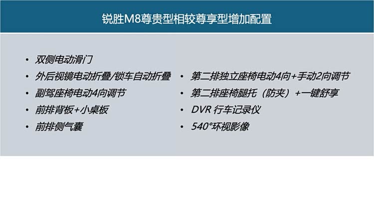 尊贵型是锐胜M8产品体系中配置跃升最明显的版本。相较尊享型,价格上浮1.6万元,增加配置主要包括双侧电动滑门、外后视镜电动折叠/锁车自动折叠、副驾座椅电动4向调节、第二排独立座椅电动4向+手动2向调节、第二排座椅腿托(防夹)+一键舒享、前排背板+小桌板、DVR 行车记录仪、540°环视、前排侧气囊。