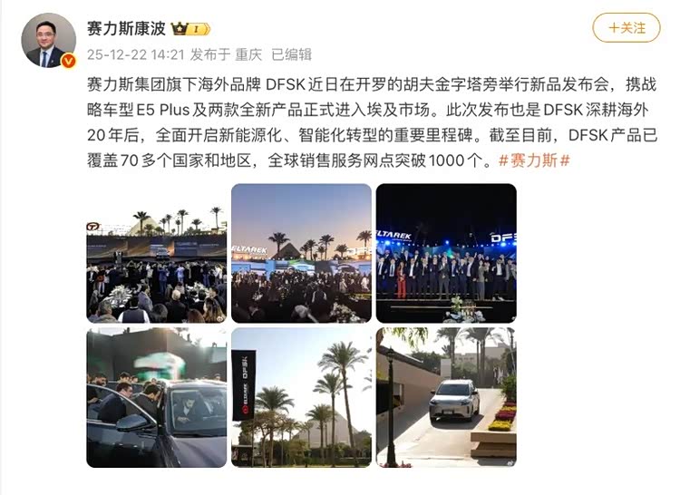 车家号·0浏览·2025-12-22 15:03 · 北京日前,赛力斯集团副总裁康波在微博上表示:“赛力斯集团旗下海外品牌DFSK近日在开罗的胡夫金字塔旁举行新品发布会,携战略车型E5 Plus及两款全新产品正式进入埃及市场。”