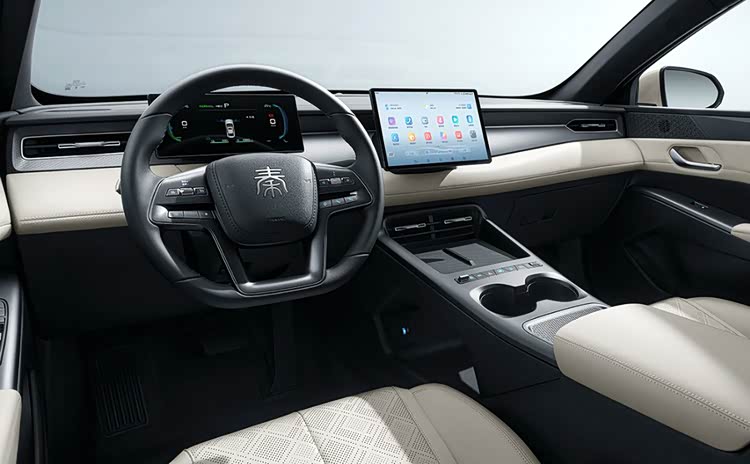 轴距达到2718mm的秦PLUS,座椅布局为五座,车内采用大面积软质材料加以包裹,也没有花里胡哨的线条扰乱视线,平底式多功能方向盘,扁平的空调出风口,厚实的座椅,大量的储物空间以及中控屏等,既透着质感和审美感,也显示出一定的科技感。