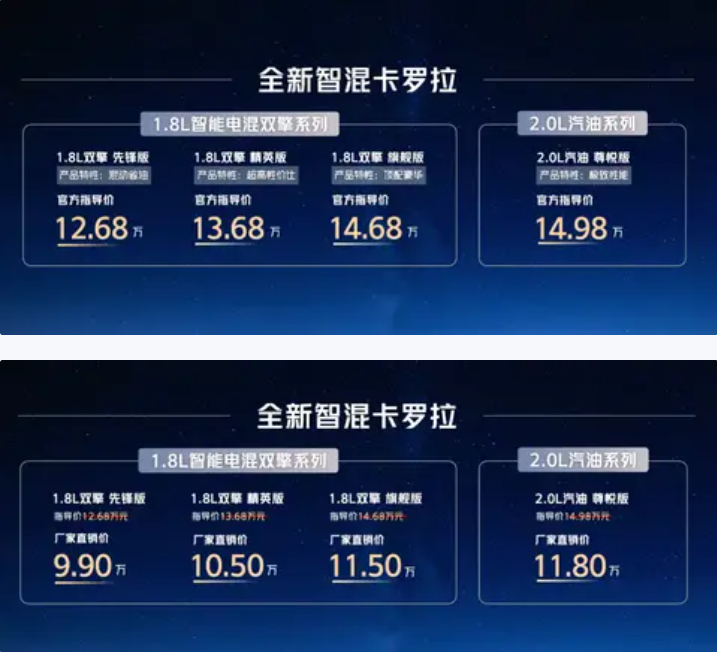 车家号·0浏览·2025-12-22 15:27 · 黑龙江日前,Auto情报处从一汽丰田官方处获悉,2026款 一汽丰田卡罗拉(参数|询价)正式上市,一汽丰田卡罗拉定位紧凑型SUV,2026款车型共推出6款车型,指导价为11.88万元-14.98万元,,厂家直销价9.9万元起,提供普通版和长轴距版本,提供1.2T,1.8L混动,2.0L自然吸气可以选择。