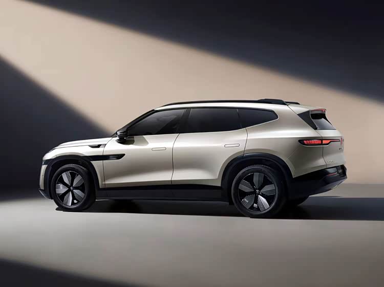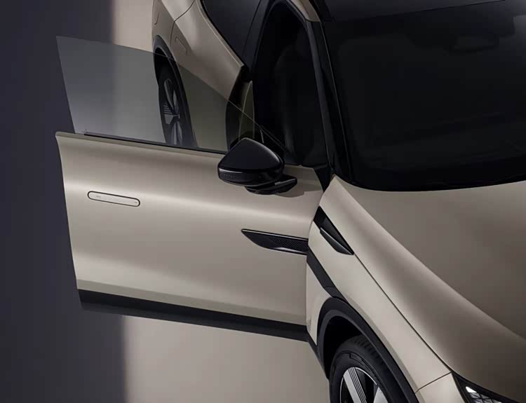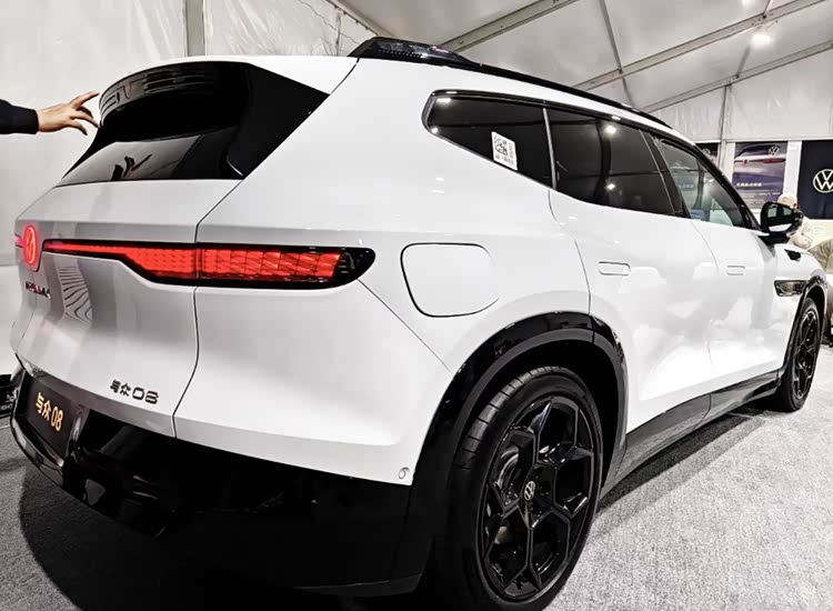 车侧一面,虽然与众08是一款大型SUV定位的产品,但其侧颜所采用的小幅度溜背布局以及流畅且不失力量感的腰线,加之隐藏式门把手、无框车门、熏黑哑光网格轮毂等设计细节,不仅丝毫不会臃肿,反而还有着轿跑SUV的灵动感与时尚气息。此外,新车长宽高分别为5000/1954/1688mm,且在选装空气悬架后,具备1672mm的车高;而轴距则达到了3030mm。