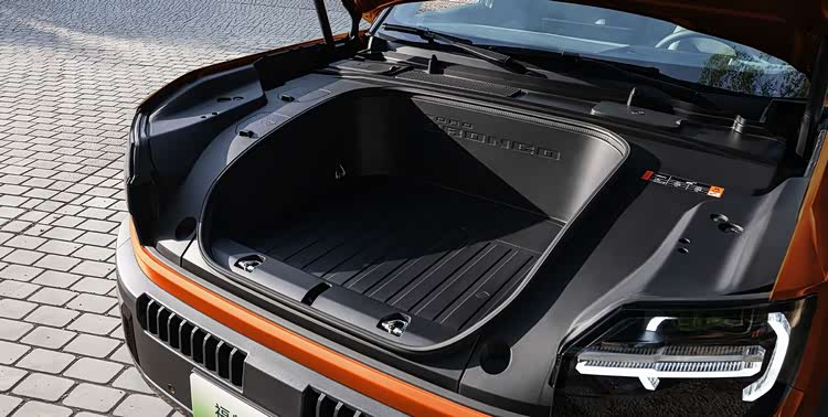 引擎盖上的贯穿式风道并非装饰,可引导气流至车顶降低风阻,配合弹出式隐藏门把手、镂空导流轮毂等空气动力学设计,大幅降低了整车的风阻系数,提升了续航能力。车尾延续外挂式备胎、侧开式尾门等经典元素,备胎罩边缘的LED灯带与前脸呼应,在传承家族基因的同时,完成了从“硬核越野”到“时尚家用”的风格转变。
