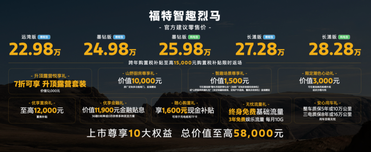 12月19日,江铃福特旗下全新新能源中型SUV—— 福特智趣烈马(参数|询价)正式宣布上市并同步开启交付。新车共推出三款增程版与两款纯电版共计五款车型,官方指导价区间为22.98万元至28.28万元。作为福特烈马家族的首款新能源车型,智趣烈马基于“福域”原生智能新能源架构打造,以“可城、可玩、可野”为核心卖点,旨在为追求多元生活方式的消费者提供一个兼具城市舒适与户外探索能力的全新选择。