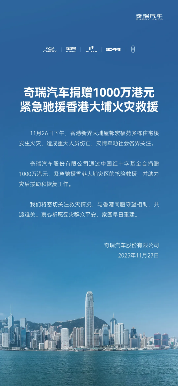 就在这人心惶惶、救援争分夺秒的关键时刻,远在内地的奇瑞汽车股份有限公司迅速作出反应,没有等待舆论发酵,也没有犹豫观望,而是第一时间通过中国红十字基金会,向灾区紧急划拨1000万港元善款。这笔资金将用于支持现场灭火后的善后处理、伤者医疗救治、临时安置以及后续社区重建等迫切需求。虽然钱不能挽回逝去的生命,但至少能为幸存者撑起一把遮风挡雨的伞,为重建生活点燃一丝希望。