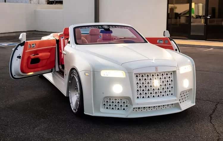 外观方面,劳斯莱斯曜影限量版通体采用了白色涂装,最吸睛的变化就是车头。由一块布满三角形几何图案孔洞的白色塑料板取代了标志性的镀铬格栅。对,你没看错!就是白色塑料。而且这种元素也被应用在了雾灯以及下方进气口区域,整体看起来有种未来感。另外,一对圆形的辅助灯从保险杠突出,而原厂大灯则被车身套件部分遮挡。标志性的欢庆女神立标也采用了白色涂装,双R车标则变成了与内饰同色调的橙色。