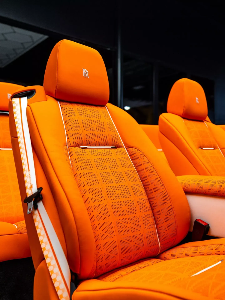 内饰说实话相当有夜店风,采用高对比度的白色和橙色皮革拼接而成,饱和度相当高。车内的布局则沿袭了普通版劳斯莱斯曜影的设计理念,保留了大量的物理按键和机械结构,整体营造出了相当强的复古感,再加上如今橙白色的内饰,整体给人的感觉一言难尽,确实像是迪拜改装品牌能设计出来的东西。