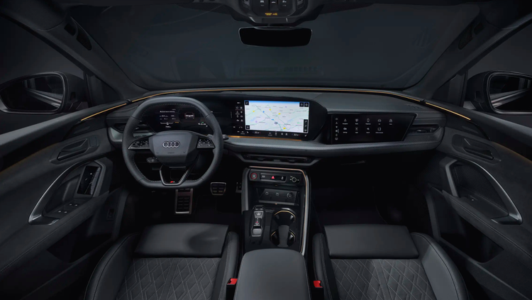 来到内饰,全新奥迪Q5L延续了定位更高的Q6L e-tron的造型,即主驾偏向驾驶员的11.9英寸液晶仪表搭配14.5英寸曲面中控屏,并且还有全系标配的副驾娱乐屏,科技感相当到位。此外,新车还会配备13.1英寸HUD投屏,支持“四屏联动”,不过从当前配置表来看,只有顶配会给到。