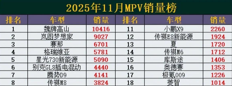 第一名为魏牌高山,也是上个月MPV中唯一一款销量破万的。