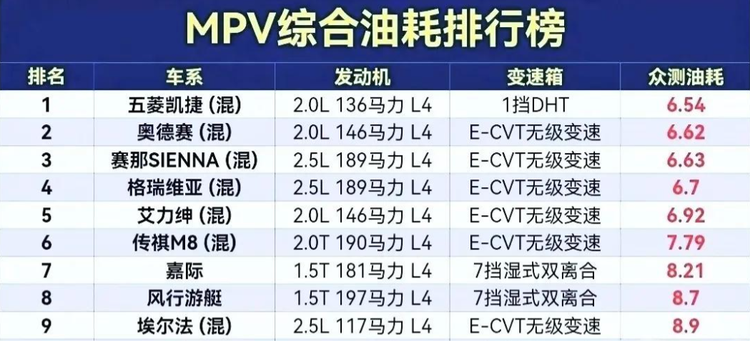MPV车型一直以来都是耗油大户,尤其是纯燃油的车型,动辄耗油就会高达10升以上。所以为了避免大家伙少踩坑,我查找了一份MPV的综合油耗数据,或许能帮助大家选车。