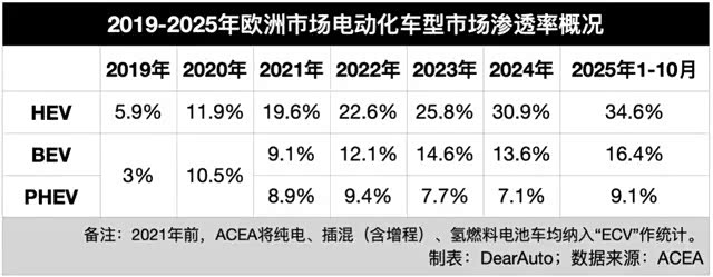 但比起产品力不足可能造成的市场反响冷淡,增长放缓的纯电动车需求或许才是最为致命的。据ACEA统计,今年前10个月,欧洲BEV市占率为16.4%,与2024年相比上涨2.8个百分点。作为对比,享受相对更少政策补贴的PHEV,份额也上涨了2个百分点,而几乎不享受政策补贴的HEV份额则上涨了3.7%。