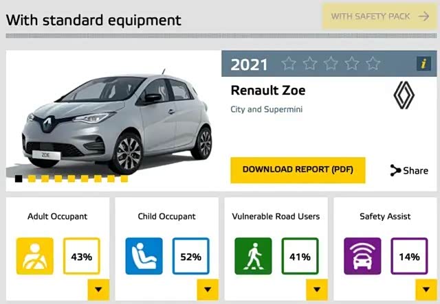 从2013年的“五星安全车”到2021年的安全评级0星,雷诺ZOE曾被指在安全防护上“严重退化”,比如减配头部安全气囊、把通常作为标配的部分主动安全功能(如车道偏离预警、AEB主动刹车)作为选配。